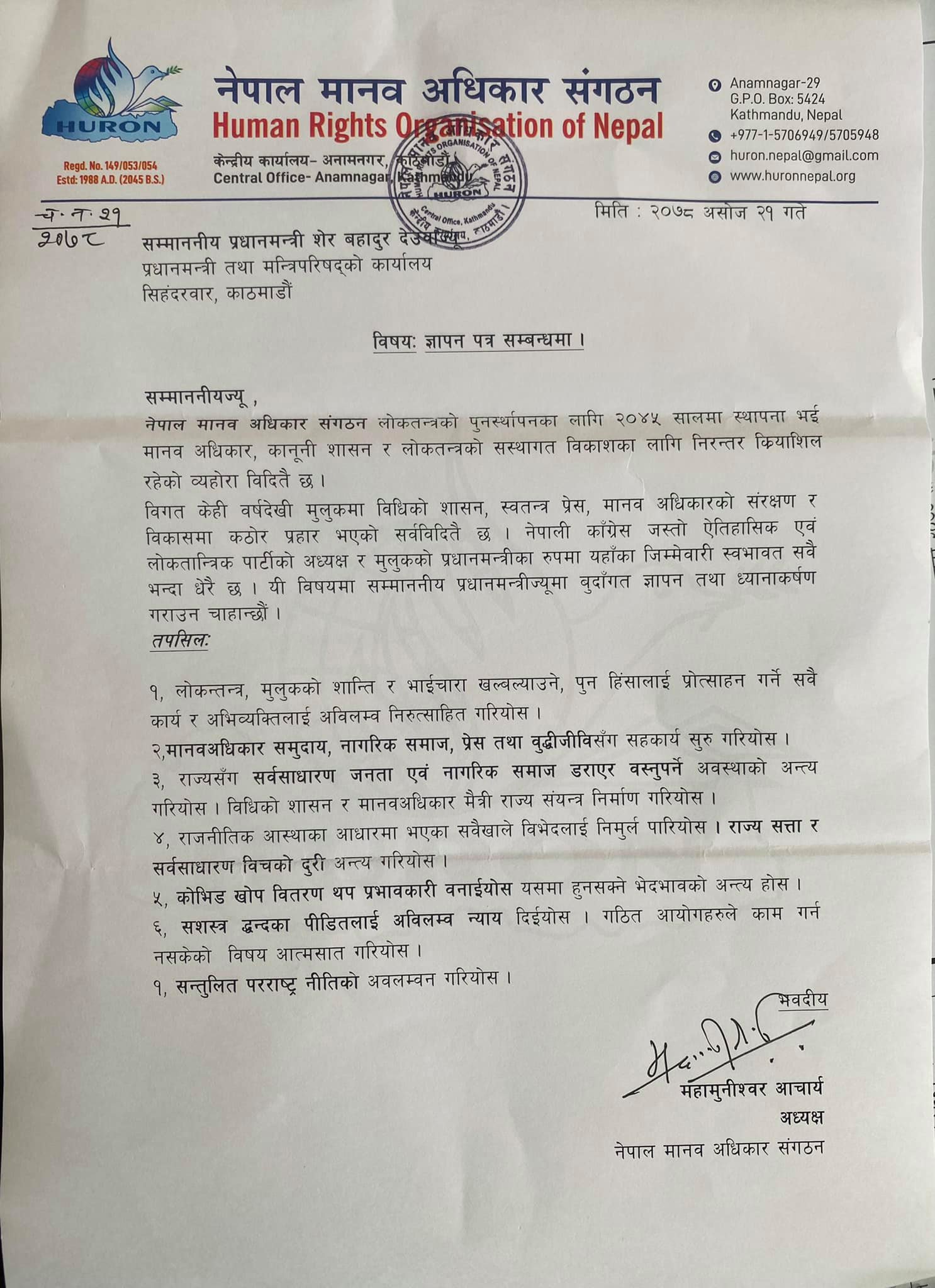 नेपाल मानव अधिकार संगठनको एक टोलीले आज सम्माननीय प्रधानमंत्री शेरवहादुर देउवालाई भेट गरी ज्ञापनपत्र वुझायो ।